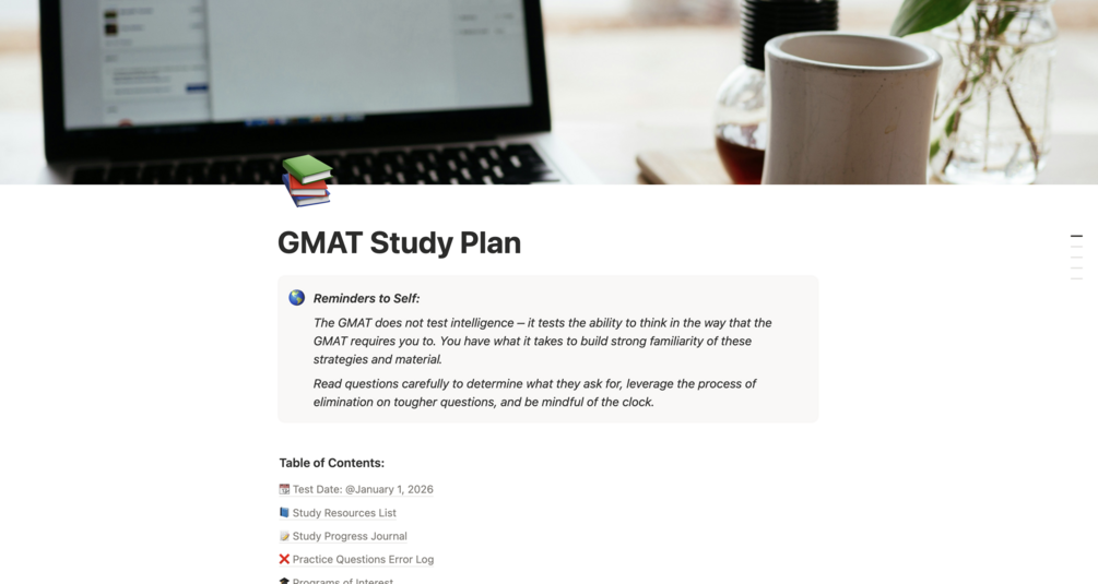 A GMAT Study Planner designed to optimize your business school application workflow, tailor your studying, and think ahead to what's next. This Notion template features a pre-made list of free and paid study resources, a study log to track your progress and consistency, an error log for fine-tuning your approach, and a clean system to take note of business schools of interest.